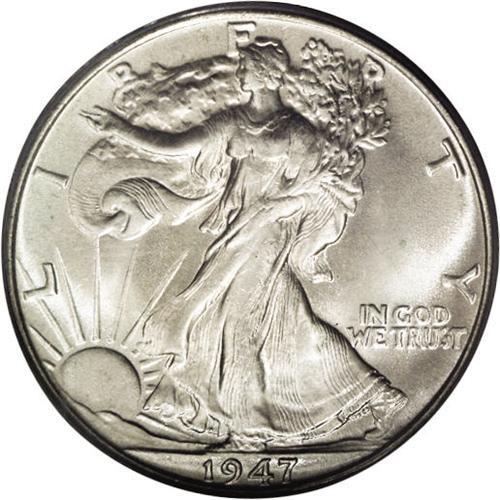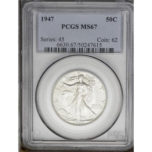 <B>1947<50C> MS67 PCGS.</B></I> This final year of issue example displays radiant luster and silver-gray surfaces imbued with whispers of light tan color in restricted areas. The design features are well struck, with partial definition apparent on the thumb of Liberty's left hand. The surfaces are well preserved, with just a few minute marks exhibited on Liberty's face and neck and on the eagle's midsection. Population: 17 in 67, none are finer at either service (4/06).