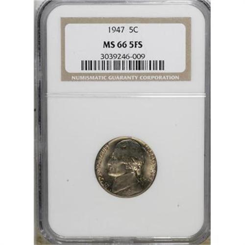 <B>1947 5C MS66 Full Steps NGC.</B></I> NGC Census: (5/0). PCGS Population (42/0). (#84031)<BR><BR><b>Shipping:</b> Coins & Currency (<a target="_blank" href="http://www.heritageauctions.com/common/shipping.php">view shipping information</a>)
