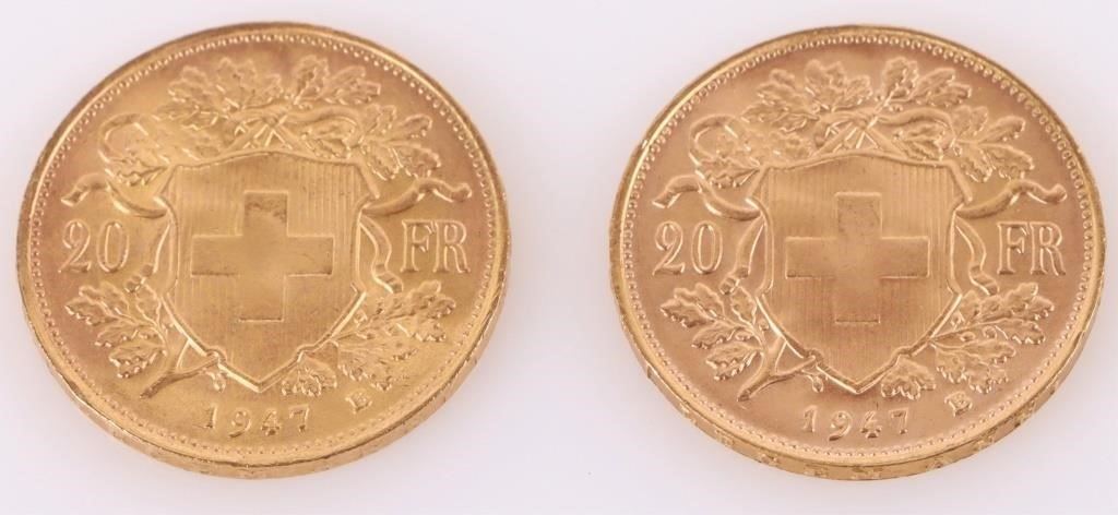 1947 90% gold 20 Francs Swiss Helvetia coins. Lot of 2.
