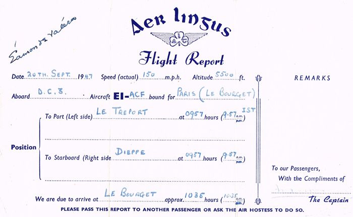 Two Aer Lingus flight reports to Le Bourget and Northolt dated 20 and 25 September respectively. Signed in upper right corner by Éamon de Valera. Also with de Valera's calling card as Taoiseach. (3 items)
