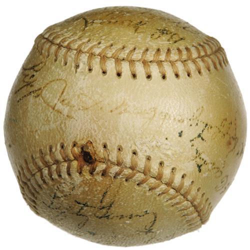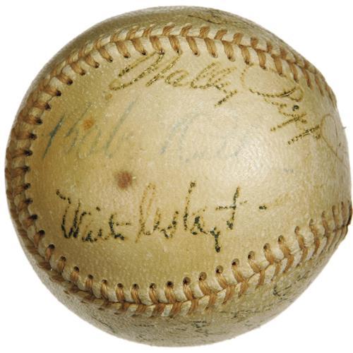 <B>1947 Babe Ruth Day Signed Baseball with Ruth, DiMaggio.</B></I> The legendary Bambino saw his number "3" retired from pinstriped operation this day in a touching ceremony that spawned Nat Fein's Pulitzer Prize-winning photograph of a feeble legend taking a final Bronx bow. The event also spawned to this important artifact, one whose historic birthdate is matched only by its remarkable cast of characters. Surprisingly (or perhaps not), it is Joe DiMaggio who claimed the sweet spot of the Babe Ruth Day baseball for himself, leaving the honoree to head west to a side panel. Joining this pair of baseball gods are Hoyt, Ruffing, McCarthy, Gomez, Pipp, Shawkey, Dugan, Wilcy Moore, Hassett, Meusel, Schang and Aaron Ward. Signature quality ranges from 2/10 to 8/10, with surface wear to the OAL (Harridge) ball the main condition factor. Ruth rates 4/10, with DiMaggio a point lower. The balance of the Hall of Famers are of similar strength with the exception of Hoyt who rates 7/10. A mounting hole and some mild splitting at the seams must be noted but do not affect signatures in any way. The first signed baseball we've ever seen from the Babe's last appearance in uniform. <I>LOA from PSA/DNA. LOA from James Spence Authentication.</B></I><BR><BR><b>Shipping:</b> Balls, Pucks, etc., Small (<a target="_blank" href="http://www.heritageauctions.com/common/shipping.php">view shipping information</a>)