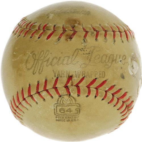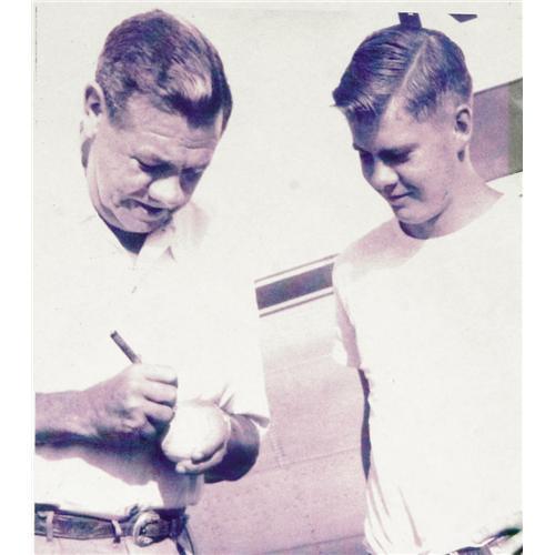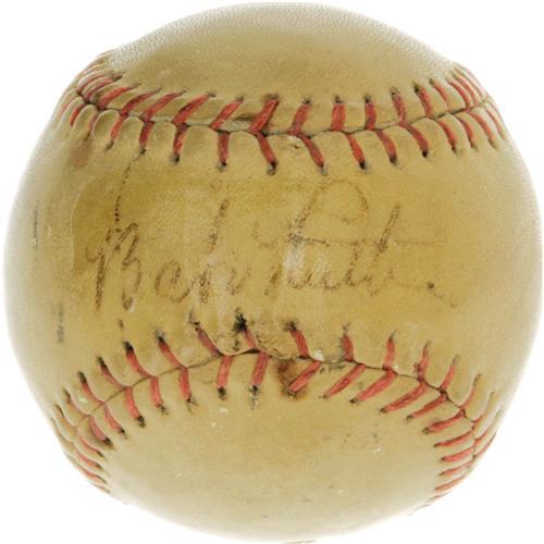 <B>1947 Babe Ruth Signed Baseball with Photo Documentation.</B></I> This "Official League" orb was once the proud possession of a young ballplayer named Bob Yurko, who was photographed by the local newspaper as he watched the Babe sign it. A pair of photocopies of the August 22, 1947 Tribune reprint the scene, and note that Ruth had been watching an amateur game in Billings, Montana before heading for the coast. The ball that the Babe holds in his hands in that newspaper still retains a tremendous amount of appeal these six decades later, with a 5/10 sweet spot signature projecting from beneath a thin brushing of shellac. The ball itself has toned to a moderate brown shade and shows some mild damage on another panel (invisible upon display) from having been mounted into some sort of display. A perfectly respectable example of this essential single, made all the more appealing by the added documentation. <I>LOA from PSA/DNA.</B></I>