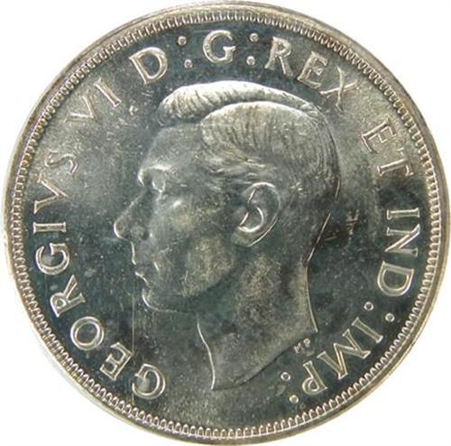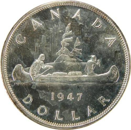 Canada Silver Dollar 1947 Blunt 7, Doubled HP PCGS MS-64. This is a very strongly struck example with great lustre and near flawless pale golden toned surfaces. It is tied as the eighth highest graded by PCGS