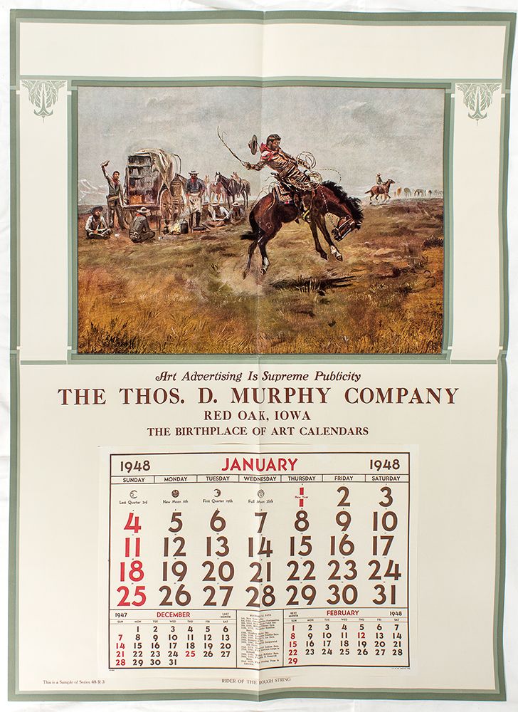 c1947 This is a 32"x 42" broadside calendar broadside from 1947. It has Chas. Russell's print "Riders of the Rough String" and is in very good condition. - HKA#65951