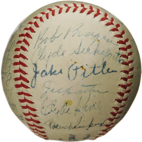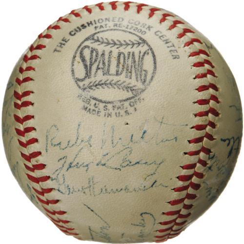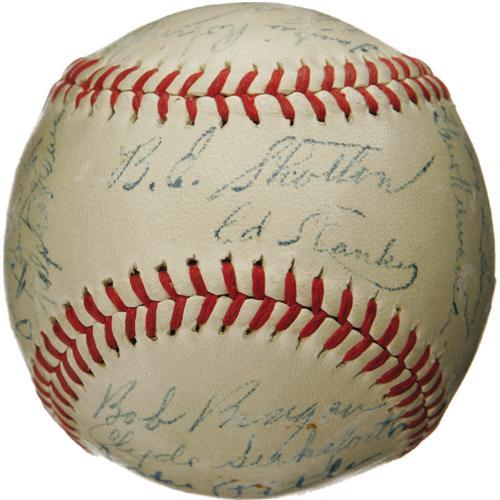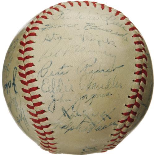 <B>1947 Brooklyn Dodgers Team Signed Baseball with Jackie Robinson and Branch Rickey.</B></I> Arguably the most important baseball team in the game's history is memorialized here, a club that earns that distinction for the introduction of the first African-American player in Big League history. The brave racial pioneer Jackie Robinson appears at the top of a side panel on this ONL (Frick) sphere, just above fellow Cooperstown resident Arky Vaughan, the Pirates legend who was closing out his career at Ebbets. Incredibly, the Hall of Fame front office man Branch Rickey, who was single-handedly responsible for making the decision to end decades of racial injustice within our National Pastime, is here as well, the only time we've ever found him on a '47 Dodgers sphere. Twenty-two other National League Champs fill out the cast of characters, notably Reese, Reiser, Branca, Hermanski, Lavagetto and Jorgensen. Shotton and Stanky are clubhouse versions. Signature quality is an impressive and consistent 8/10, and the ball is clean with light, even toning. One of the most significant and appealing autographed baseballs to arise in the hobby in recent memory. <I>LOA from PSA/DNA. LOA from James Spence Authentication.</B></I><BR><BR><b>Shipping:</b> Balls, Pucks, etc., Small (<a target="_blank" href="http://www.heritageauctions.com/common/shipping.php">view shipping information</a>)