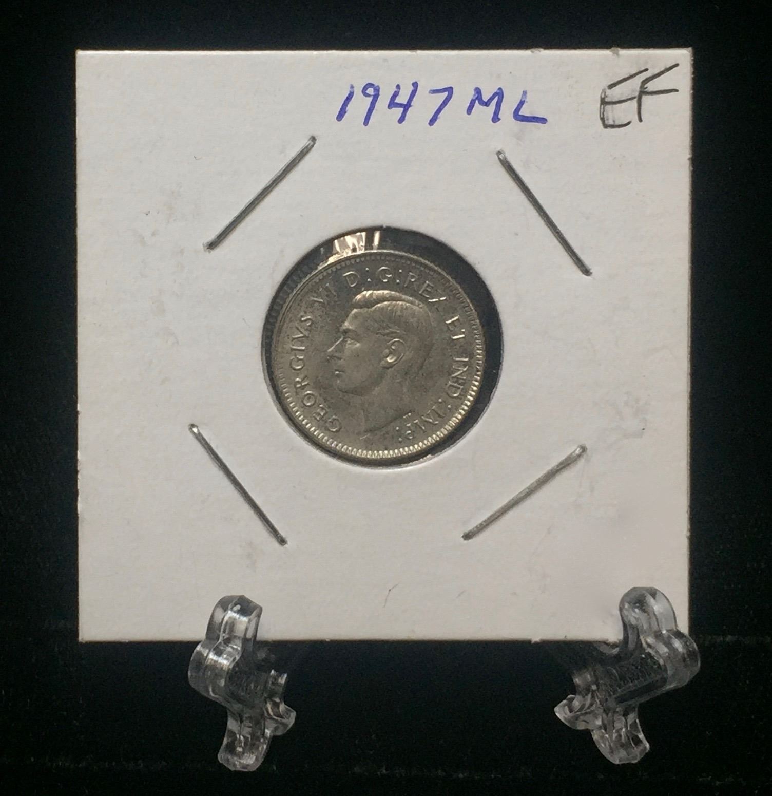 Lot 335; 1947 Canada 10-Cens Maple Leaf Silver Coin Extra Fine, Very Nice Detail, Silver .800, King George VI Effigy, Condition as Pictured
