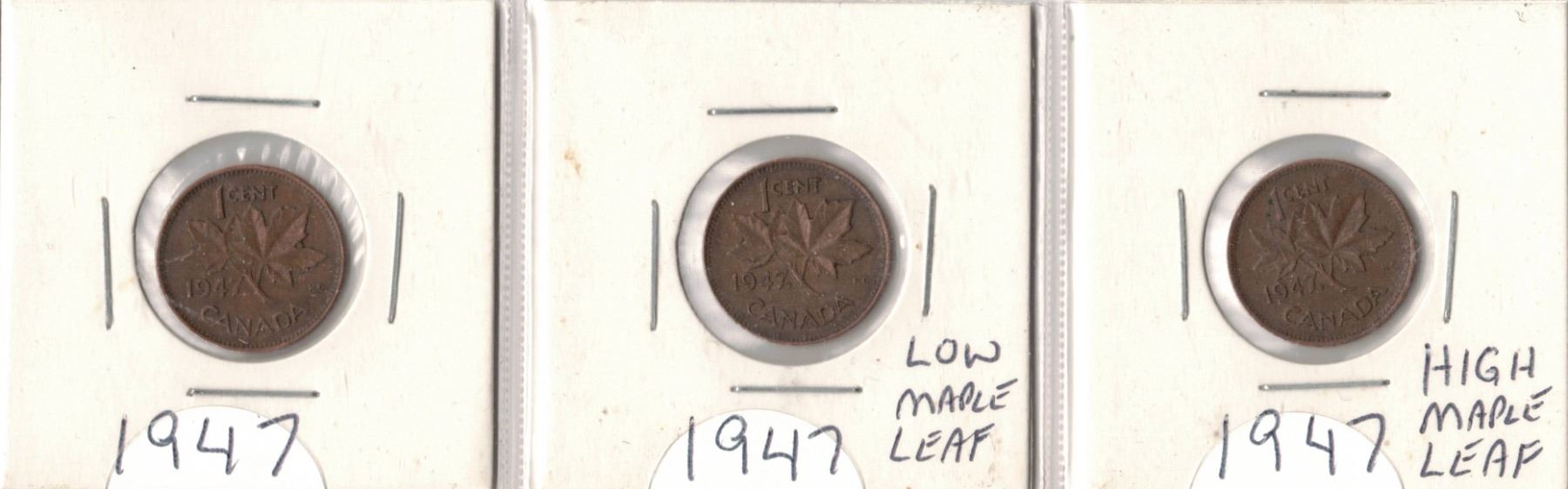 1947 Canadian One Cents - No Maple Leaf, Low Maple Leaf, High Maple Leaf