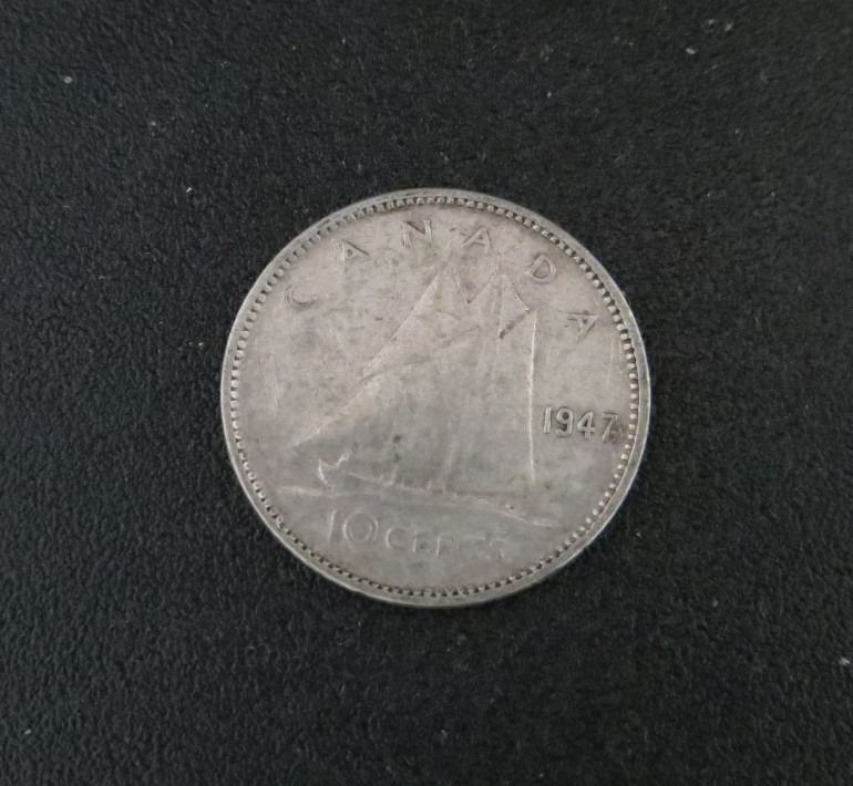 1947 Canadian Silver 10 Cent Coin Maple Leaf