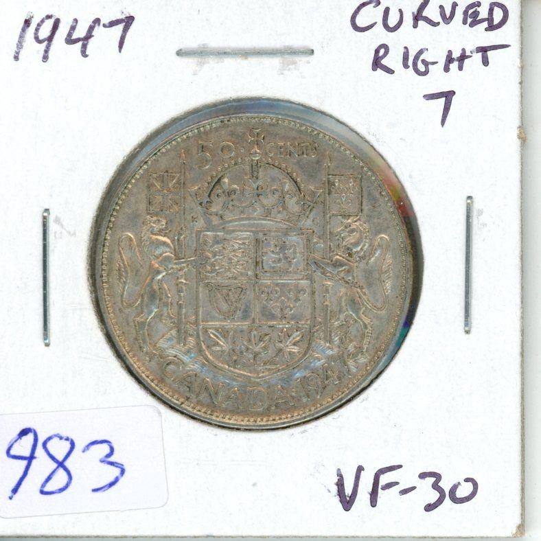 1947 Canadian Silver 50 Cents with Curved Right 7. VF-30.