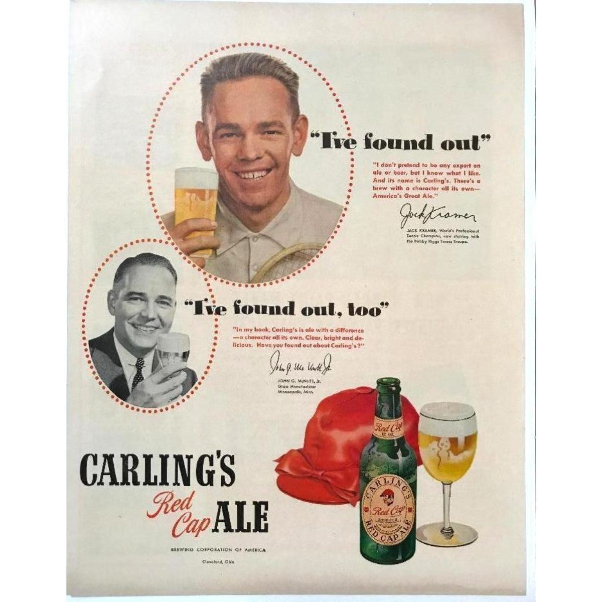 Original 1947 magazine ad for Carling's Red Cap Ale, features professional tennis champion Jack Kramer & businessman John G. McNutt Jr. 11" X 14" mounted on archival linen canvas for preservation.