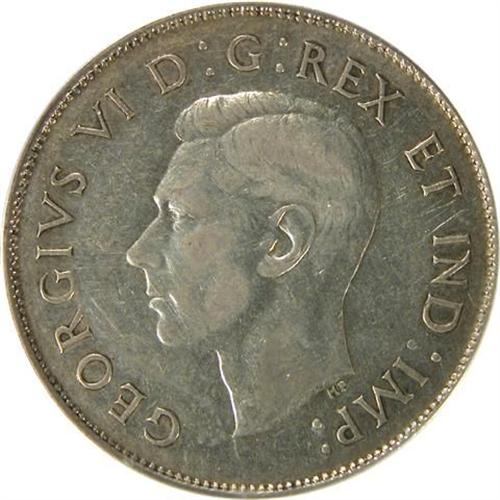 Canada Fifty Cents 1947 Curved 7 Maple Leaf PCGS VF-35. This is a light golden toned example, and it also has the typical weakness at the top of the shield on the reverse