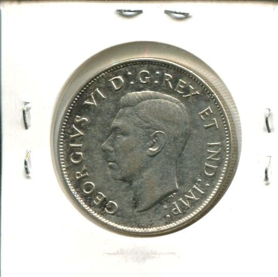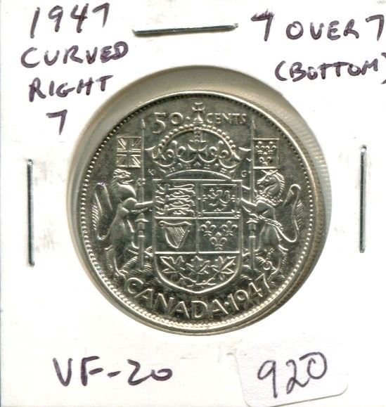 1947 Curved Right 7 with 7 Over 7 Canadian Silver 50 Cents. Scarce. VF-20.