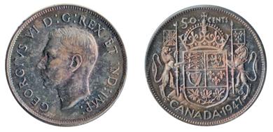 1947. Curved Right. ICCS Mint State-65. A richly toned example with iridescent toning, predominately deep purple-blue. Dark golden highlights enhance this attractive George VI fifty cents piece. The solo ‘Finest’ graded example by ICCS.