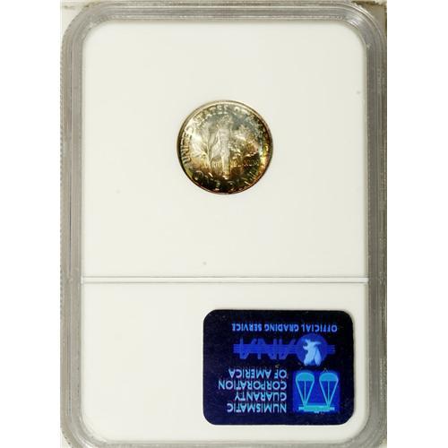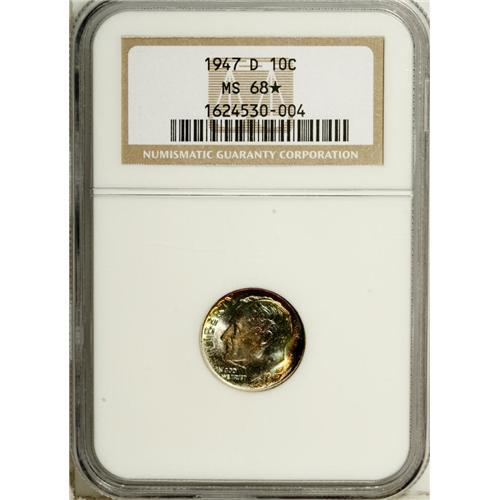 <B>1947-D 10C MS68 <img border='0' src='http://www.heritagecoins.com/images/star.gif' width=10 height=10> NGC.</B></I> Well struck with bands and patches of blue-green, lemon-yellow, and peach-orange patina on each side. Of the three examples of this issue graded MS68 by NGC, this is the only one to receive the Star (10/06).<BR><BR><b>Shipping:</b> Coin/Currency (<a target="_blank" href="http://www.heritageauctions.com/common/shipping.php">view shipping information</a>)