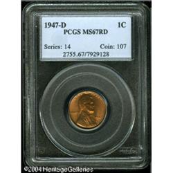 1947-D 1C MS67 Red PCGS. Well struck and radiantly <B>1947-D 1C MS67 Red PCGS.</B></I> Well struck and radiantly lustrous, with attractive reddish toning streaks on each side, a couple of tiny water spots in the fields, and a small carbon speck on Lincoln's collar. Exquisitely preserved and seemingly blemish-free on both obverse and reverse, a no-questions Superb Gem. Population: 50 in 67, 0 finer (10/04). <BR><BR><B>Important notice:</B> Heritage usually auctions material at the rate of 200-250 lots per hour. On some occasions eBay Live bid software or the Internet may not be able to keep up with the pace of the auction. We recommend placing a realistic absentee bid now as insurance to avoid disappointment. Occasionally the auctioneer may eliminate or reject an eBay Live bid, and the auctioneer may also reopen a lot after the close of the eBay live bidding (usually because we missed an audience bid), and may reject your bid even if it shows you as the winning bidder. By bidding via eBay Live, you agree that Heritage may award the lot to another bidder at its sole discretion under the circumstances described above or any other reasonable circumstances. Since eBay bids are not shown to us until we open the lot on the floor, we treat those bids just like floor bids. In most cases the floor responds before the eBay bid is presented to us, due to Internet lag time, so for consistency we have made it a policy that floor bids are always considered first over tie eBay live bids. Also please note that all Heritage lots purchased through eBay Live carry a 20% Buyer's Premium. Please make sure you read the Terms and Conditions before you bid. This lot is being auctioned in conjunction with a live floor auction by Heritage Galleries & Auctioneers. All final auction and invoice information will be supplied by Heritage Galleries & Auctioneers, and all other information should be considered preliminary. Lot:5366