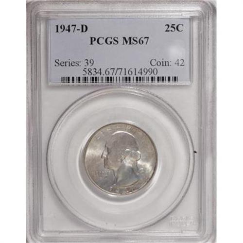 <B>1947-D 25C MS67 PCGS.</B></I> PCGS Population (103/0). NGC Census: (509/0). Mintage: 15,338,400. Numismedia Wsl. Price for NGC/PCGS coin in MS67: $200. (#5834)<BR><BR><B>Coin Engraver:</B> John Flanagan<BR><BR><b>Shipping:</b> Coins & Currency (<a target="_blank" href="http://www.heritageauctions.com/common/shipping.php">view shipping information</a>)