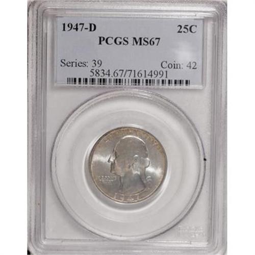 <B>1947-D 25C MS67 PCGS.</B></I> PCGS Population (103/0). NGC Census: (509/0). Mintage: 15,338,400. Numismedia Wsl. Price for NGC/PCGS coin in MS67: $200. (#5834)<BR><BR><B>Coin Engraver:</B> John Flanagan<BR><BR><b>Shipping:</b> Coins & Currency (<a target="_blank" href="http://www.heritageauctions.com/common/shipping.php">view shipping information</a>)