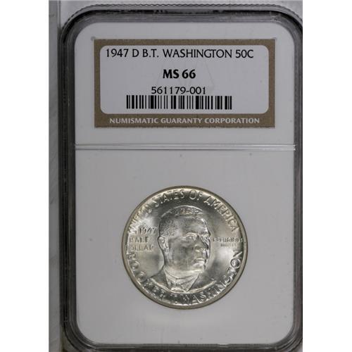 <B>1947-D<50C> Booker T. Washington MS66 NGC.</B></I> A nicely struck example, mostly untoned on the obverse with pleasing luster. The reverse has small milk spots near the Hall. NGC has certified just two higher-graded examples (8/06).