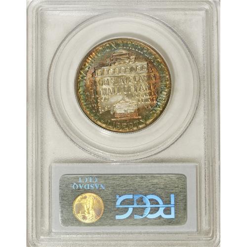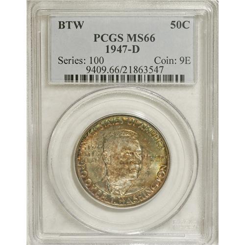 <B>1947-D 50C Booker T. Washington MS66 PCGS.</B></I> This highly lustrous representative has tan-gold and blue-green patina over much of the obverse, while the reverse has ocean-blue, plum, and reddish-orange toning around a silver-gray rectangle in the center. After the extensive mintages of 1946, the 100,017 pieces coined at each mint for 1947 reflected more modest ambitions. PCGS has certified no higher-graded examples (4/07).<BR><I>From The Cary & Cheryl Porter Collection.</B></I><BR><BR><b>Shipping:</b> Coins & Currency (<a target="_blank" href="http://www.heritageauctions.com/common/shipping.php">view shipping information</a>)