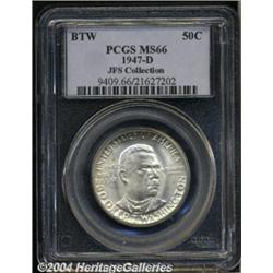 <B>1947-D<50C> Booker T. Washington MS66 PCGS.</B></I> A hint of honey color visits the fields of this splendidly lustrous premium Gem. The fields are gorgeously undisturbed, and the strike is above average for the BTW type. A superlative representative of this conditionally rare issue. Population: 34 in 66, none finer (6/04).<BR><I>From the JFS Collection, the #1 All-Time PCGS Registry Set.</B></I> <BR><BR><B>Important notice:</B> Heritage usually auctions material at the rate of 200-250 lots per hour. On some occasions eBay Live bid software or the Internet may not be able to keep up with the pace of the auction. We recommend placing a realistic absentee bid now as insurance to avoid disappointment. Occasionally the auctioneer may eliminate or reject an eBay Live bid, and the auctioneer may also reopen a lot after the close of the eBay live bidding (usually because we missed an audience bid), and may reject your bid even if it shows you as the winning bidder. By bidding via eBay Live, you agree that Heritage may award the lot to another bidder at its sole discretion under the circumstances described above or any other reasonable circumstances. Since eBay bids are not shown to us until we open the lot on the floor, we treat those bids just like floor bids. In most cases the floor responds before the eBay bid is presented to us, due to Internet lag time, so for consistency we have made it a policy that floor bids are always considered first over tie eBay live bids. Also please note that all Heritage lots purchased through eBay Live carry a 20% Buyer's Premium. Please make sure you read the Terms and Conditions before you bid. </span></font></tr></table></td></tr></table>