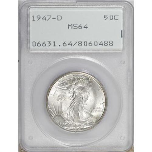 <B>1947-D 50C MS64 PCGS.</B></I> PCGS Population (4364/4620). NGC Census: (1954/4061). Mintage: 3,900,600. Numismedia Wsl. Price for NGC/PCGS coin in MS64: $58. (#6631)<BR><BR><B>Coin Engraver:</B> Adolph A. Weinman<BR><BR><b>Shipping:</b> Coins & Currency (<a target="_blank" href="http://www.heritageauctions.com/common/shipping.php">view shipping information</a>)