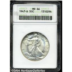 <B>1947-D<50C> MS66 ANACS.</B></I> Lustrous and generally untoned with a couple of tiny milling marks visible in the right obverse field. <BR><BR><B>Important notice:</B> Heritage usually auctions material at the rate of 200-250 lots per hour. On some occasions eBay Live bid software or the Internet may not be able to keep up with the pace of the auction. We recommend placing a realistic absentee bid now as insurance to avoid disappointment. Occasionally the auctioneer may eliminate or reject an eBay Live bid, and the auctioneer may also reopen a lot after the close of the eBay live bidding (usually because we missed an audience bid), and may reject your bid even if it shows you as the winning bidder. By bidding via eBay Live, you agree that Heritage may award the lot to another bidder at its sole discretion under the circumstances described above or any other reasonable circumstances. Since eBay bids are not shown to us until we open the lot on the floor, we treat those bids just like floor bids. In most cases the floor responds before the eBay bid is presented to us, due to Internet lag time, so for consistency we have made it a policy that floor bids are always considered first over tie eBay live bids. Also please note that all Heritage lots purchased through eBay Live carry a 20% Buyer's Premium. Please make sure you read the Terms and Conditions before you bid.