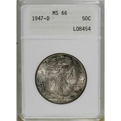 <B>1947-D 50C MS66 ANACS.</B></I> NGC Census: (658/36). PCGS Population (824/8). Mintage: 3,900,600. Numismedia Wsl. Price for NGC/PCGS coin in MS66: $240. (#6631)<BR><BR><B>Coin Engraver:</B> Adolph A. Weinman<BR><BR><b>Shipping:</b> Coins & Currency (<a target="_blank" href="http://www.heritageauctions.com/common/shipping.php">view shipping information</a>)
