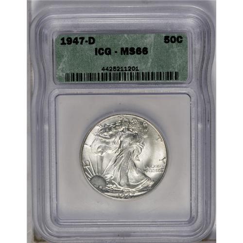 <B>1947-D<50C> MS66 ICG.</B></I> Bright frosty luster, a bold strike, and clean fields combine to enhance the already pleasing eye appeal of this final-year Walker.