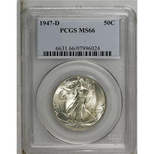 <B>1947-D 50C MS66 PCGS.</B></I> Traces of champagne-gold color glom onto radiantly lustrous surfaces that exhibit well impressed design features. A small indentation is noted on Liberty's left (right facing) breast.<BR><BR><b>Shipping:</b> Coins & Currency (<a target="_blank" href="http://www.heritageauctions.com/common/shipping.php">view shipping information</a>)