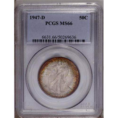 <B>1947-D<50C> MS66 PCGS.</B></I> Well defined with soft satiny luster and pleasing pink-gray toning, with vivid orange-red and lime-green peripheral coloration. Impressively preserved and nearly blemish-free on both sides. Virtually unobtainable any finer.