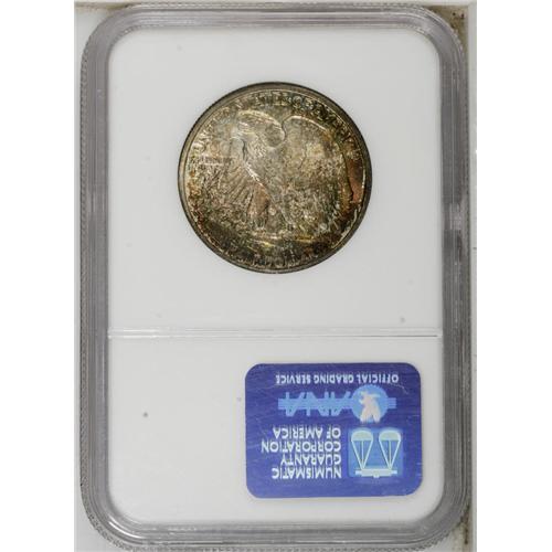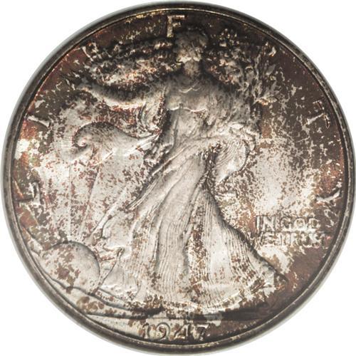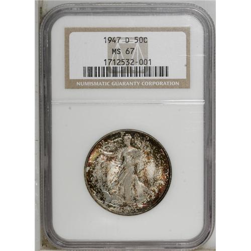 <B>1947-D 50C MS67 NGC.</B></I> A beautifully toned Superb Gem with liberal speckles of crimson, orange, and olive-green toning that have a tendency to gravitate to the borders and protected areas. While not particularly scarce in Choice or even Gem condition, Superb examples of this final year D-mint have proven to be elusive. Census: 36 in 67, 0 finer (12/06).<BR><BR><b>Shipping:</b> Coin/Currency (<a target="_blank" href="http://www.heritageauctions.com/common/shipping.php">view shipping information</a>)
