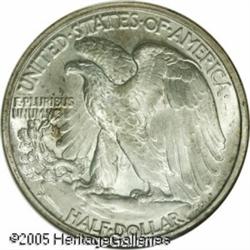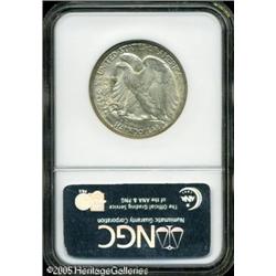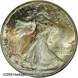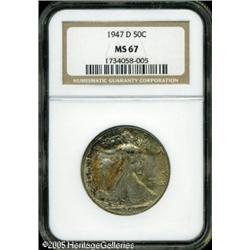 <B>1947-D 50C MS67 NGC.</B></I> The '47-D has a relatively low mintage (a little over 3.9 million pieces), but was heavily saved as the last year of the issue. MS64 and MS65 specimens are readily available, but higher graded pieces become quite elusive. The combined NGC and PCGS population reports indicate 38 pieces at the MS67 level, with none graded higher (1/05). Our own records are in general agreement, showing only 28 MS67 examples offered for sale by the major auction houses over the past seven years or so. We show no higher-graded pieces as having appeared. The present coin features splashes of burnt-orange and crimson on the obverse, and hints of olive-gray on the reverse. The design elements are relatively well struck up, with nice definition on Liberty's skirt lines, and at least partial definition in the left thumb area. Lustrous surfaces are well preserved, though a small luster graze is visible on Liberty's left breast. Population: 31 in 67, 0 finer (1/05). Lot:8212