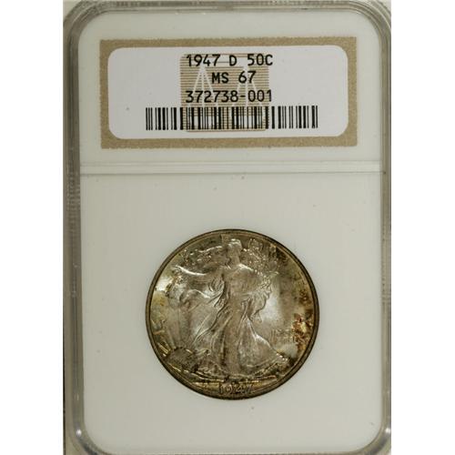 1947-D 50C MS67 NGC. The reverse has dappled russet an