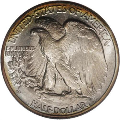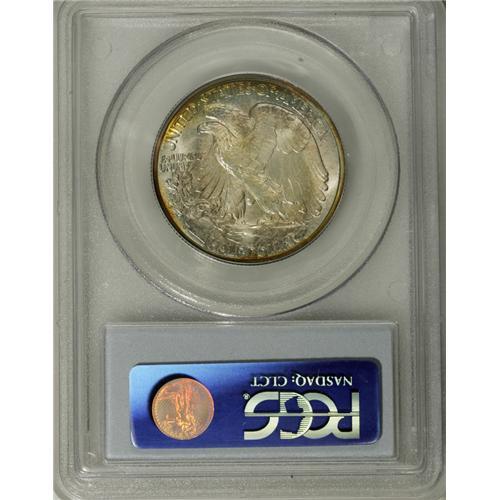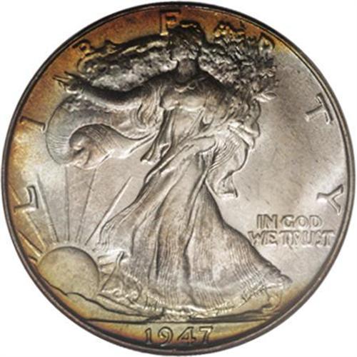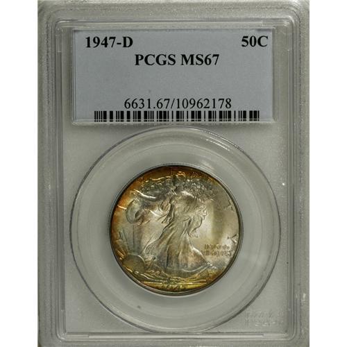 <B>1947-D 50C MS67 PCGS.</B></I> Beautiful powder-blue, orange, and lemon bands adorn the margins of this lustrous final year Walking Liberty half. Marks are virtually absent, and the strike is attentive throughout. Neither PCGS nor NGC has certified an example in a finer grade. Population: 8 in 67, 0 finer (12/06).<BR><BR><b>Shipping:</b> Coins & Currency (<a target="_blank" href="http://www.heritageauctions.com/common/shipping.php">view shipping information</a>)
