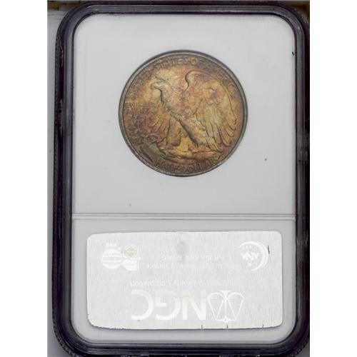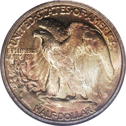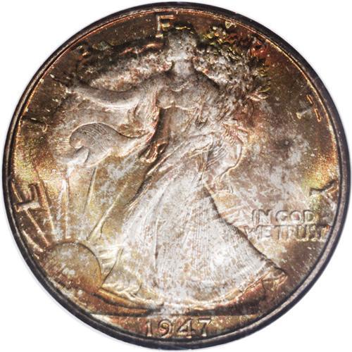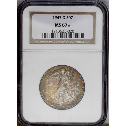 <B>1947-D<50C> MS67 <img border='0' src='http://www.heritagecoins.com/images/star.gif' width=10 height=10> NGC.</B></I> The final year 1947-D has emerged as one of the most difficult Short Set issues at the near-ultimate MS67 grade level. Those that do qualify for this lofty assignment often originate with government issued Mint sets from this year. Coins from these sets were exposed to sulphur-laden paper and cardboard, with silver issues often displaying outstanding toning characteristics. We doubt if any '47-D Walker from an original Mint set could possibly exceed the aesthetic and technical merits of this coin. Mottled burnt-orange and magenta toning liberally covers each side, with occasional lime-green iridescence interspersed over the reverse. Population: 4 in 67 <img border='0' src='http://www.heritagecoins.com/images/star.gif' width=10 height=10>, 0 finer (4/06). <BR><BR><B>Important n