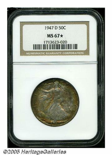 <B>1947-D<50C> MS67 <S NGC.</B></I> This cataloger had to do a double take when he saw the spectacular coin offered here, thinking that it had already been described. The similarities to the Superb Gem from the last lot are more easily explained when one notices that they were submitted together and are likely from the same mint set (which contain two of each issue). Half of the MS67 Star population is represented here, enjoy!