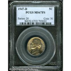 1947-D 5C MS67 Full Steps PCGS. Vibrant luster rad <B>1947-D 5C MS67 Full Steps PCGS.</B></I> Vibrant luster radiates through a melange of gold, violet, sky blue, and olive patination. Well struck, with no mentionable marks. Population: 9 in 67, 0 finer (10/04). <BR><BR><B>Important notice:</B> Heritage usually auctions material at the rate of 200-250 lots per hour. On some occasions eBay Live bid software or the Internet may not be able to keep up with the pace of the auction. We recommend placing a realistic absentee bid now as insurance to avoid disappointment. Occasionally the auctioneer may eliminate or reject an eBay Live bid, and the auctioneer may also reopen a lot after the close of the eBay live bidding (usually because we missed an audience bid), and may reject your bid even if it shows you as the winning bidder. By bidding via eBay Live, you agree that Heritage may award the lot to another bidder at its sole discretion under the circumstances described above or any other reasonable circumstances. Since eBay bids are not shown to us until we open the lot on the floor, we treat those bids just like floor bids. In most cases the floor responds before the eBay bid is presented to us, due to Internet lag time, so for consistency we have made it a policy that floor bids are always considered first over tie eBay live bids. Also please note that all Heritage lots purchased through eBay Live carry a 20% Buyer's Premium. Please make sure you read the Terms and Conditions before you bid. This lot is being auctioned in conjunction with a live floor auction by Heritage Galleries & Auctioneers. All final auction and invoice information will be supplied by Heritage Galleries & Auctioneers, and all other information should be considered preliminary. Lot:5636