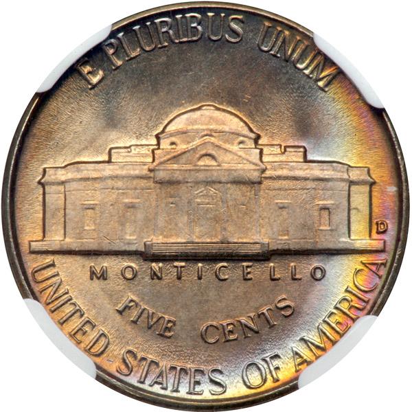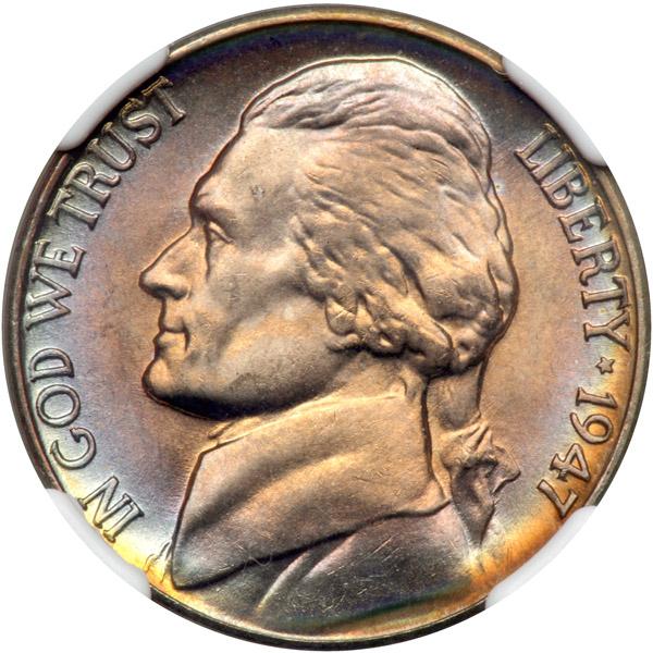 1947-D Jefferson Nickel. NGC graded MS-67 Star 5FS. Wonderful golden toning on both sides. Pop 2; none finer at NGC (PCGS # 4032) .