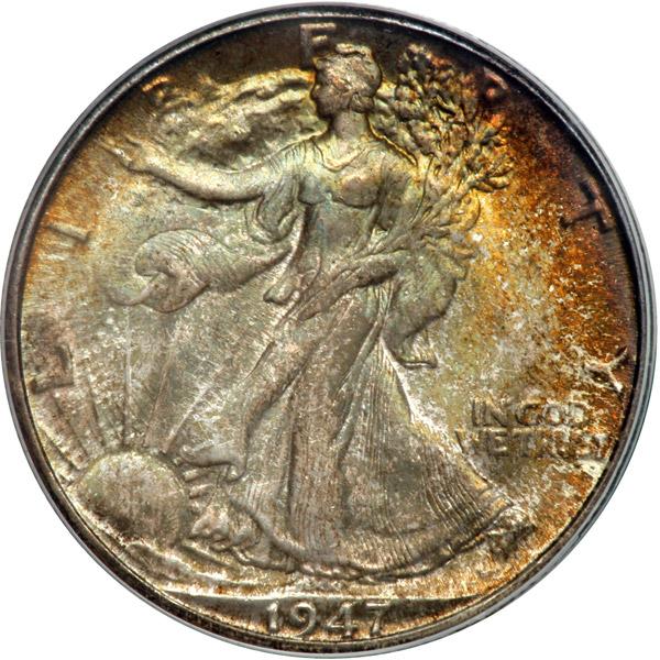 1947-D Liberty Walking Half Dollar. PCGS graded MS-66. Lovely original toning on both sides. A fully struck coin (PCGS # 6631) .