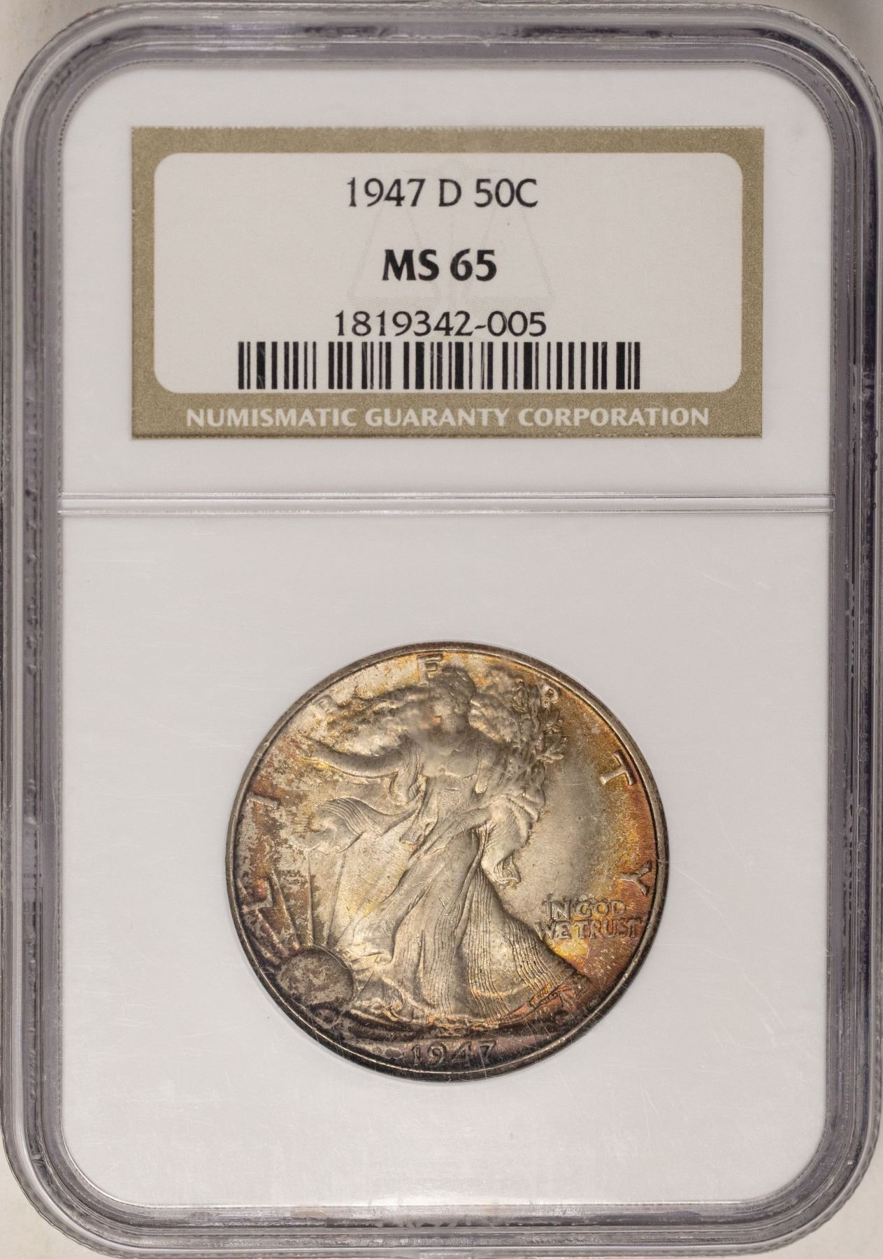 One 1947-D Walking Liberty Half Dollar Coin NGC MS65 Nice Toning.