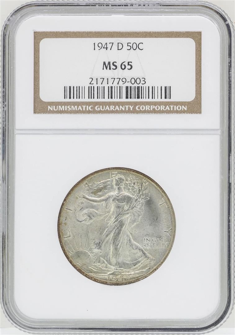 One 1947-D Walking Liberty Half Dollar Coin NGC MS65. NGC Certified.