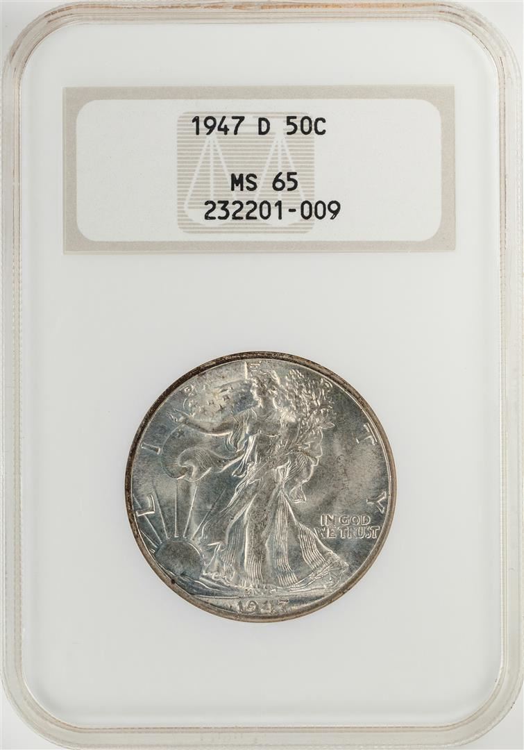 One 1947-D Walking Liberty Half Dollar Coin NGC MS65. NGC Certified.