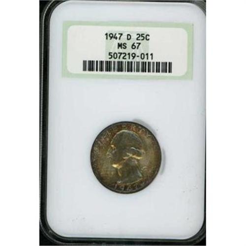 <b>1947-D Washington Quarter Dollar. NGC graded MS67.</b> Exquisite surface along with just outstanding color -- mark this one down in your catalog as one to bid on <b>(PCGS # 5834)</b>