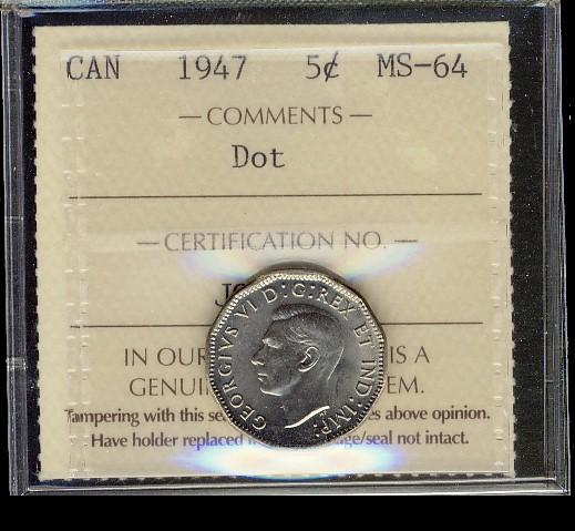 1947 Dot 5¢ ICCS MS64. Key variety in Mint condition.