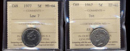 1947 Dot EF40, 1977 "Low 7" MS64 5¢, both varieties are ICCS graded.