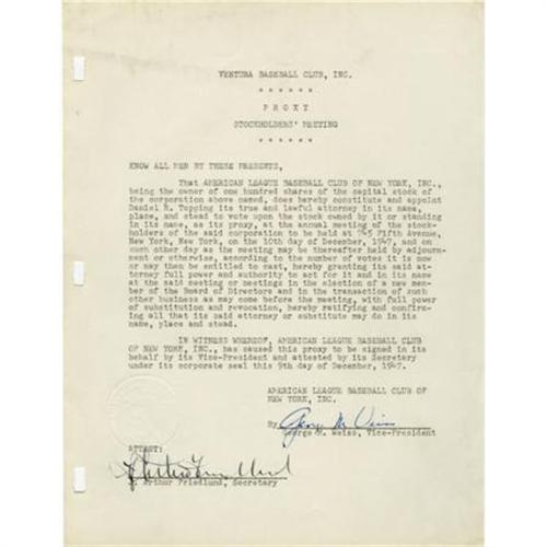 <B>1947 George Weiss Signed Typed Letter.</B></I> George Weiss, manager of the New York Yankees' farm system from 1932-47, was one of the most successful executives in Major League Baseball history. Here we offer a 1947 typed letter signed by Weiss, co-signed by J. Arthur Friedlund. Letter is in exceptional condition, with the expected fold lines the only detractors from top-notch condition. <I>LOA from PSA/DNA.</B></I><BR><BR><b>Shipping:</b> Flat Material, Small (<a target="_blank" href="http://www.heritageauctions.com/common/shipping.php">view shipping information</a>)