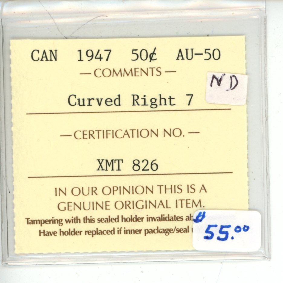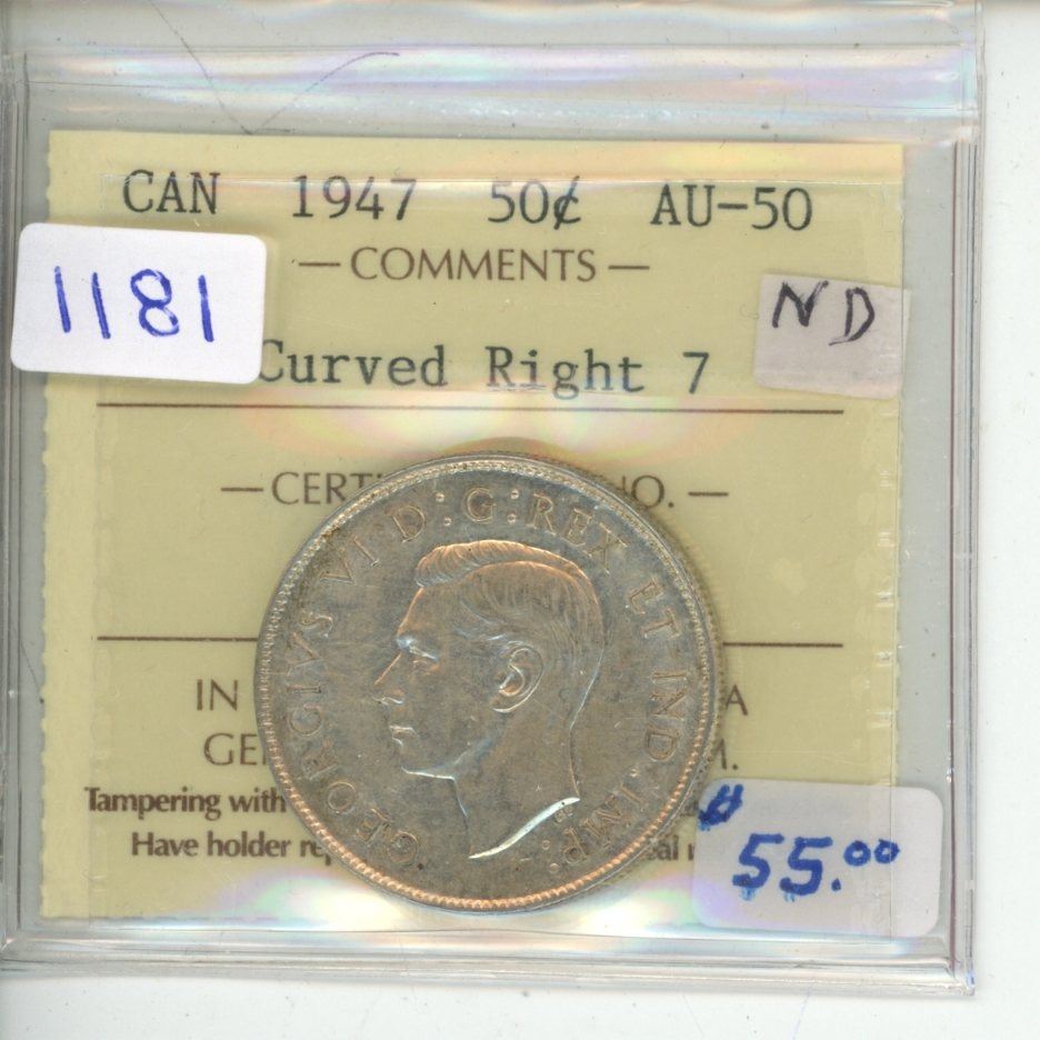 1947 ICCS Graded - Canadian Fifty Cent - Curved Right - AU50