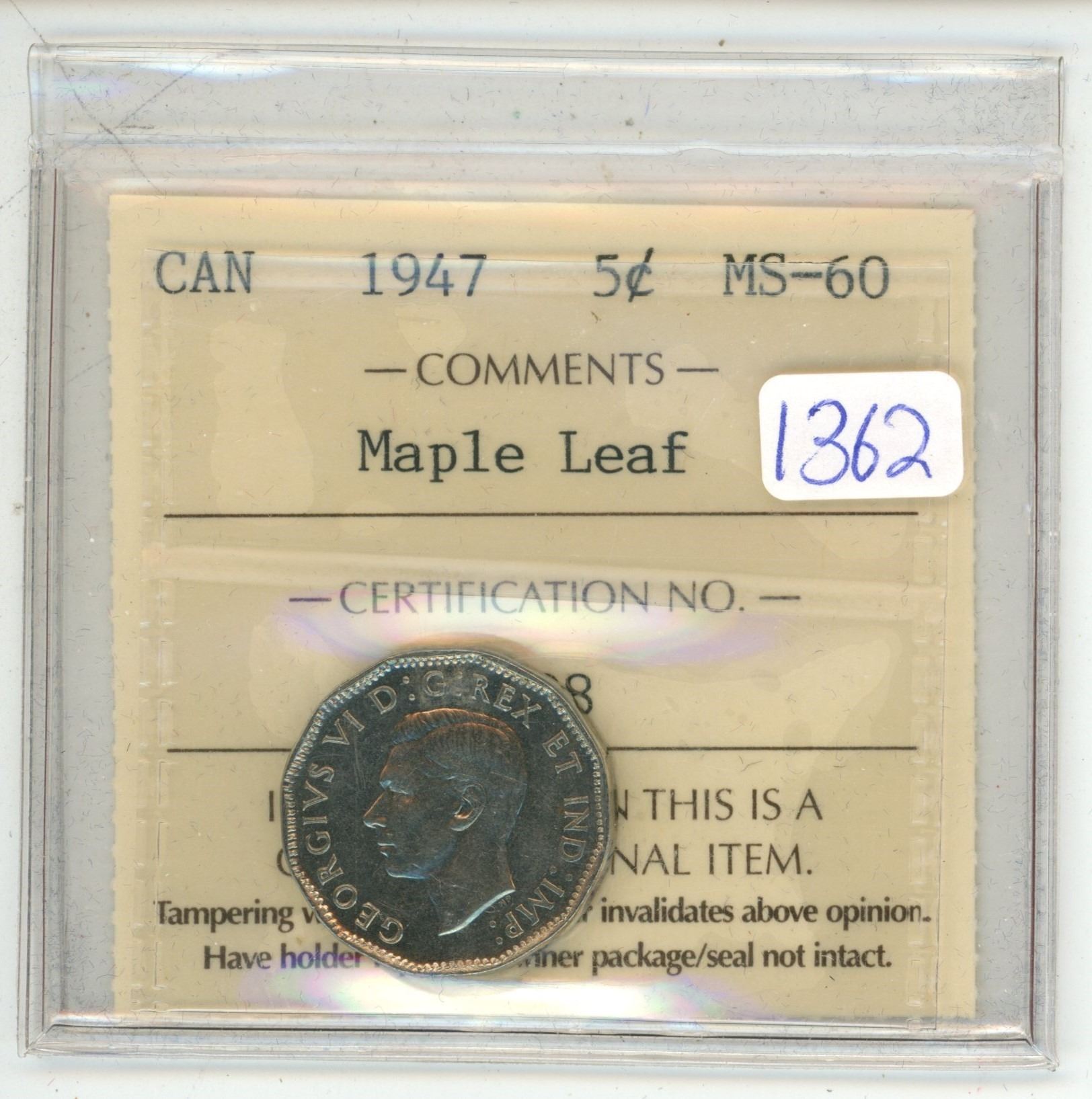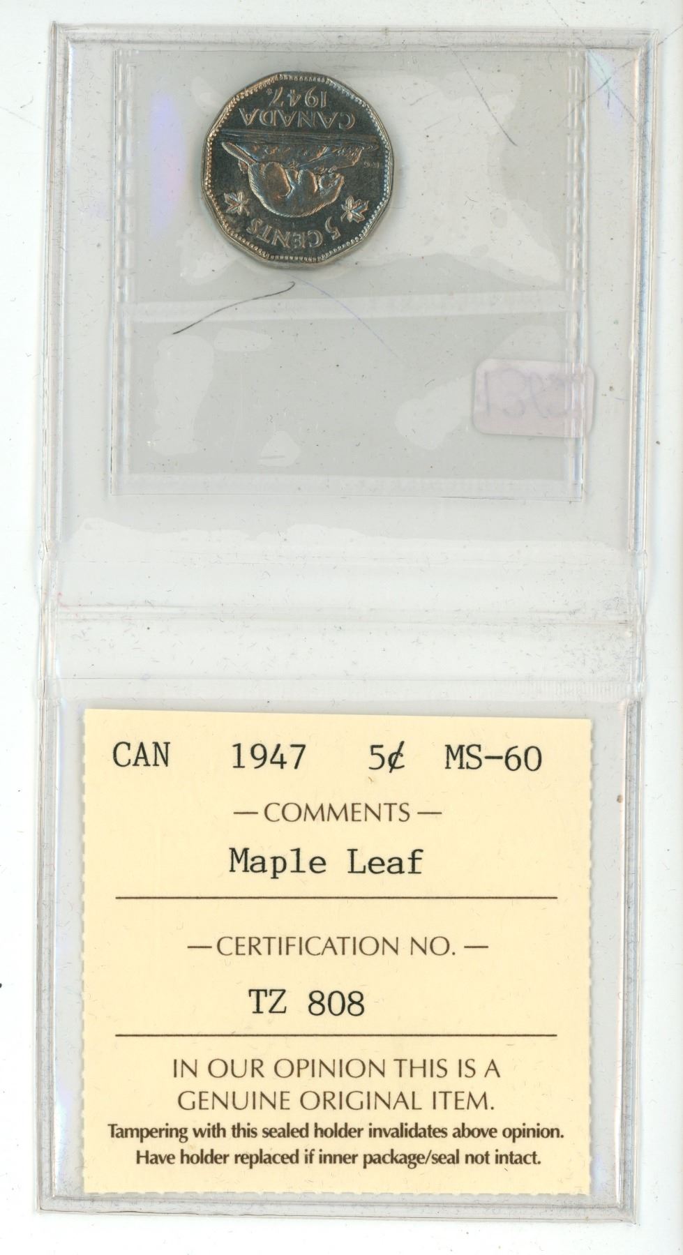 1947 ICCS graded, Canadian 5 cent coin - MS60