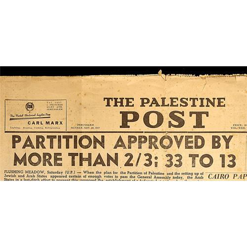 <Our item number 140246><B>Rare 1947 Jerusalem Newspaper Announcing the Partition of Palestine.</B> Rare English language Newspaper "The Palestine Post", of 30 November 1947, announcing the partition of Palestine into separate Jewish and Arab states. On 29 November 1947 the United Nations Partition Plan for Palestine or United Nations General Assembly Resolution 181, a plan to resolve the Arab-Israeli conflict in the British Mandate of Palestine, was approved by the United Nations General Assembly. Very good. <BR>Estimated Value $600 - 800. <BR><BR>Our item number 140246<BR><IMAGES><P ALIGN="CENTER"><IMG SRC="http://www.goldbergcoins.net/liveauction/49jpegs/140246.jpg"> </P></IMAGES>