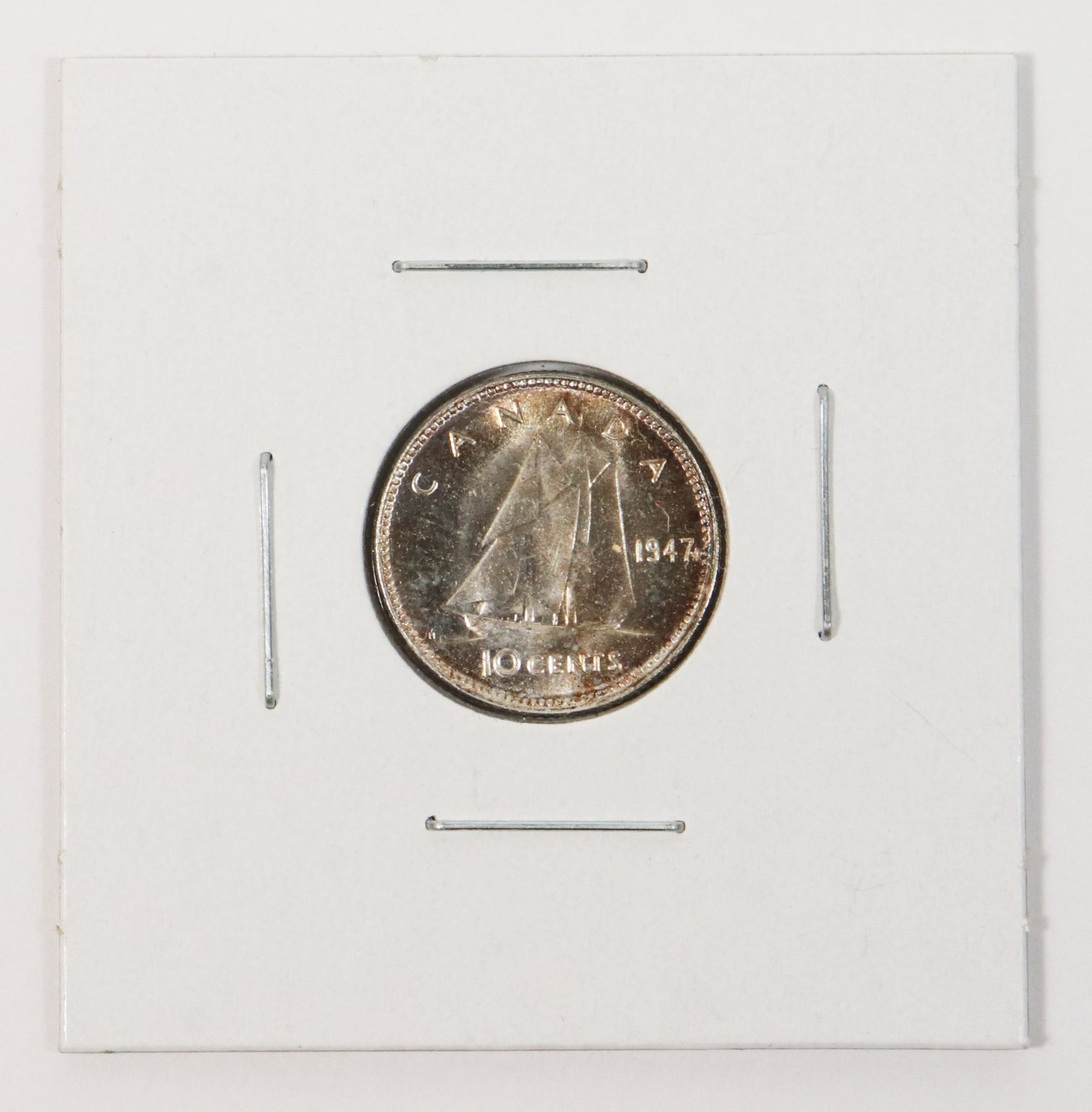 1947 MAPLE LEAF SILVER CANADA 10 CENTS COIN, BU